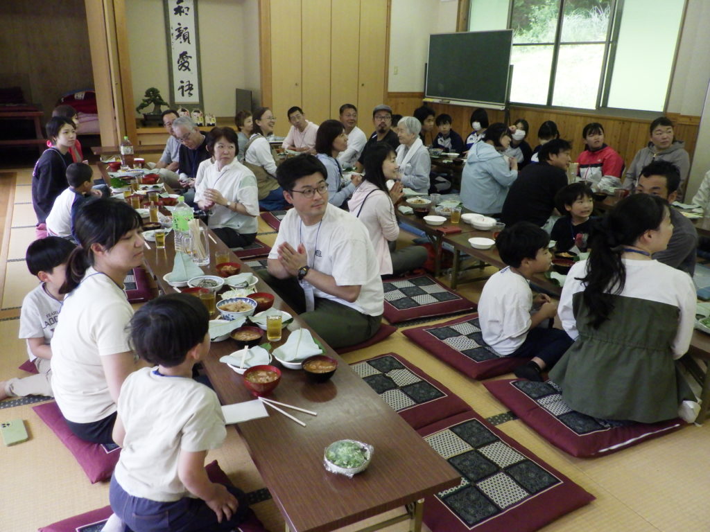 さて会場を移動してお昼ご飯です。献立は毎年恒例の「ほうば寿司」主食で豚汁やジブリ係が準備してくれた鹿肉(ロースト)にコシアブラご飯もありました。
