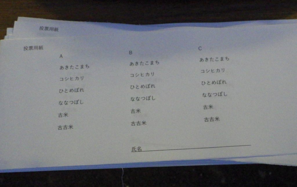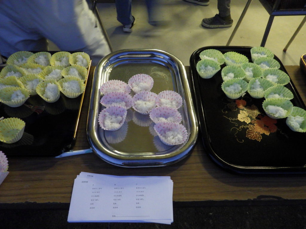 催し物として今回は「お米当てコンテスト」。3種類のご飯を用意してそれぞれの選択支から選んでいただきました。