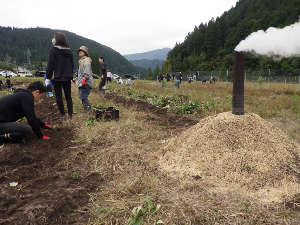 この日は,籾殻を燃やして「焼き芋」も作りました。ホイルでくるんで入れておくとおいしいおいしい焼き芋の出来上がりです。